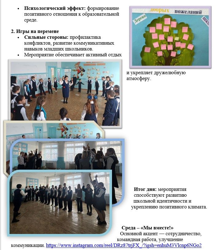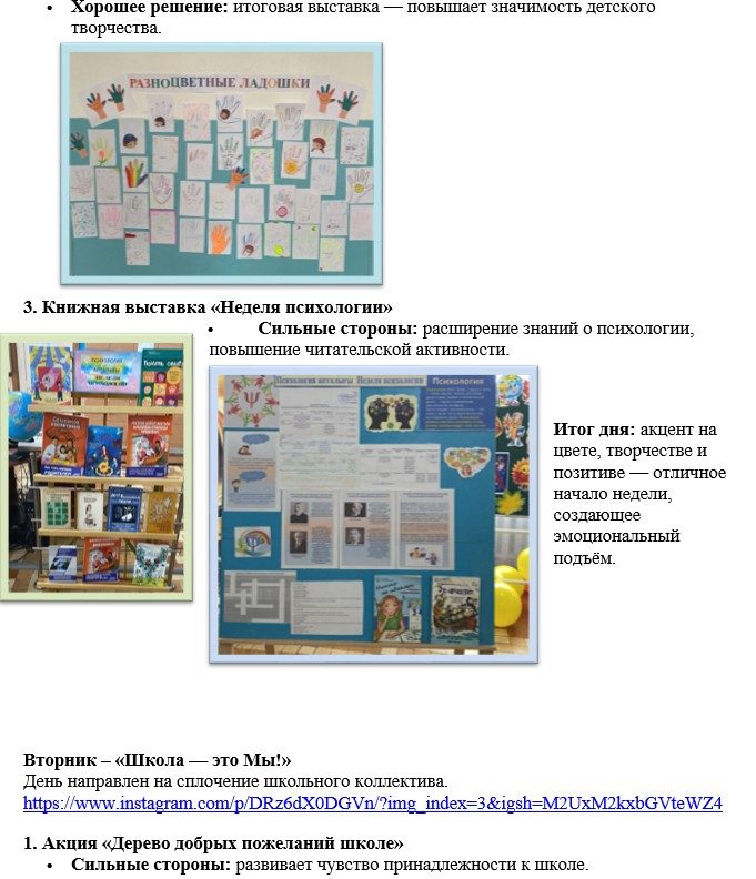 Представленный план отличается системностью, разнообразием форм работы и охватом всех категорий школьного сообщества: учащихся 1–11 классов, педагогов, сотрудников школы и частично родителей (через участие в онлайн-материалах). Мероприятия направлены на развитие эмоциональной грамотности, коммуникативных навыков, творческого потенциала и на улучшение психологического климата школы.