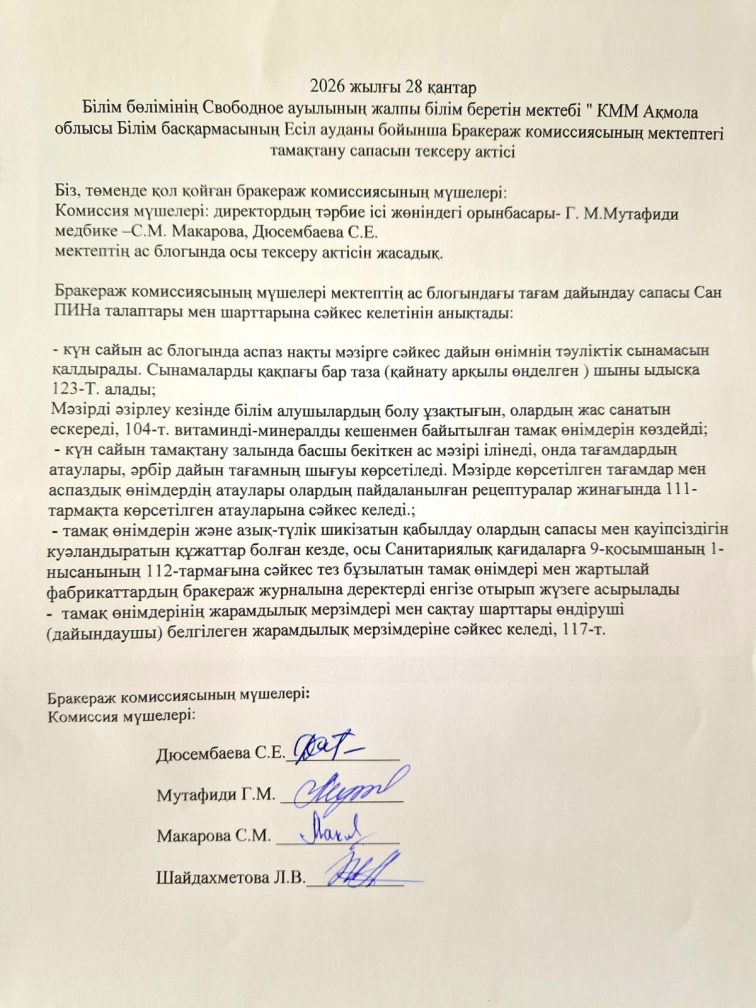 Бракераж комиссиясының мектептегі тамақтану сапасын тексеру актісі 26. 01.20025 г.