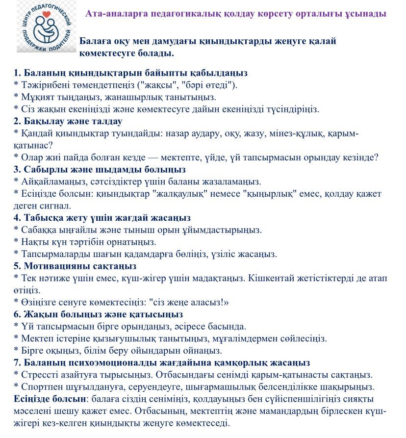 Ата-аналарға педагогикалық қолдау көрсету орталығы ұсынады Балаға оқу мен дамудағы қиындықтарды жеңуге қалай көмектесуге болады.