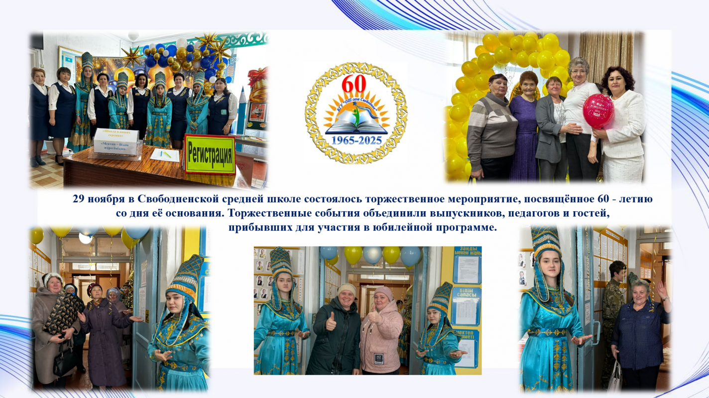 В Свободненской средней школе состоялись мероприятия, посвящённые 60 - летию со дня её основания. Торжественные события объединили выпускников, педагогов и гостей, прибывших для участия в юбилейной программе. 29 ноября школа провела торжественное мероприятие, приуроченное к юбилейной дате.