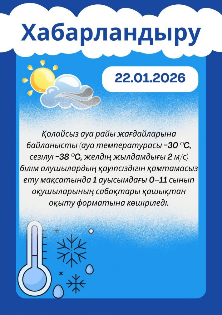 22 қаңтар. Хабарландыру. Қолайсыз ауа райына байланысты қашықтан оқыту форматына көшу