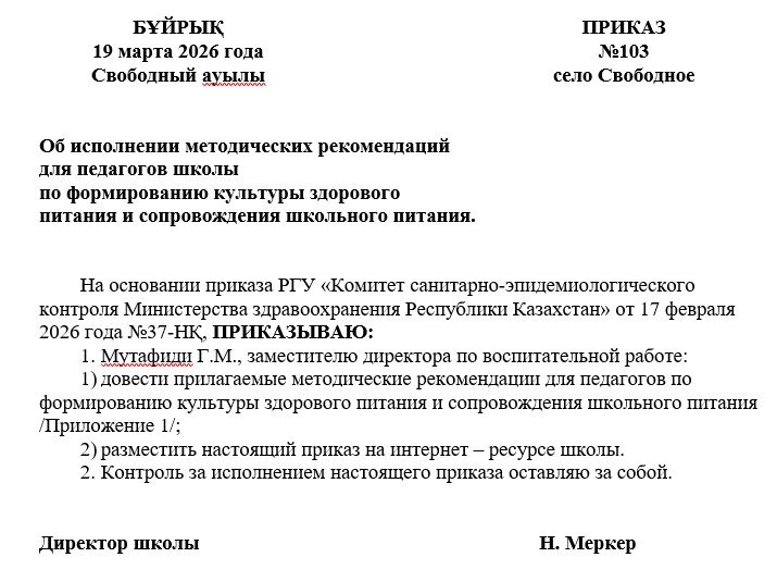 15. Результаты пилотного внедрения обновленного школьного меню в школе-гимназии г. Макинска (2025 год), реализованного в рамках проекта ФАО Казахстан TCP/KAZ/3901 «Вклад в развитие и масштабирование здорового питания» показали, что педагогическое сопровождение питания оказывает влияние, сопоставимое с качеством самого меню.
