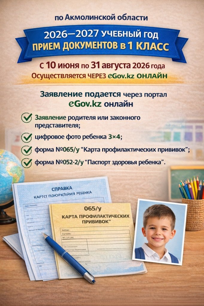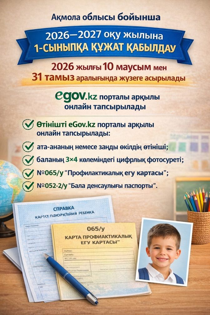 2026 жылғы 10 маусым мен 31 тамыз аралығында 1-сыныпқа құжат қабылдау басталады. Өтініш eGov.kz порталы арқылы онлайн түрде беріледі.